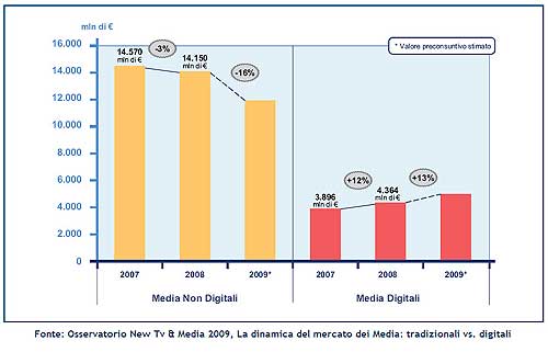 le new tv rubano spazio alla televisione classicaDiminuiscono gli introiti in advertising derivanti dai media tradizionali (stampa -20%, tv analogica -10%, radio -14%), i ricavi derivanti dalle vendite di quotidiani e periodici si riducono di circa il 20%. Le "new tv" crescono nel 2009 del 15%, arrivando a superare i 3.800 milioni di euro. E le televisioni digitali aumentano sensibilmente il proprio peso nel complessivo mercato televisivo, passando dal 35% del 2008 al 41% del 2009.